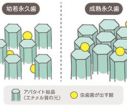 生え始めの頃はまだ歯の質が十分に完成していないので、歯が細菌の作る酸で溶かされやすい傾向があります。